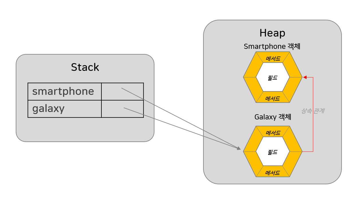 위의 과정이 이해가 되셨나요? 위에서 예시로 든 스택 영역에 존재하는 smartphone이라는 변수는, 힙 영역의 어떤 객체를 참조하나요? 다름 아닌 galaxy 객체를 참조하고 있습니다. 참조하는 것은 Galaxy 클래스의 변수이지만, 대외적으로는 Smartphone 클래스 타입으로 사용되는 것입니다. 위 코드의 첫 두 줄을 도식화한다면 아래와 같습니다.
