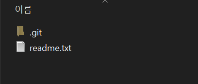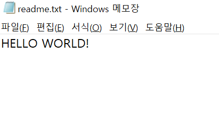 일단 비어있는 폴더(정확히는 [.git] 폴더가 숨겨져 있는)에 새로운 텍스트 파일 하나를 생성해 보겠습니다. [readme.txt]라는 파일을 하나 생성하고, HELLO WORLD!라는 한 줄짜리 텍스트를 넣고 저장합니다.