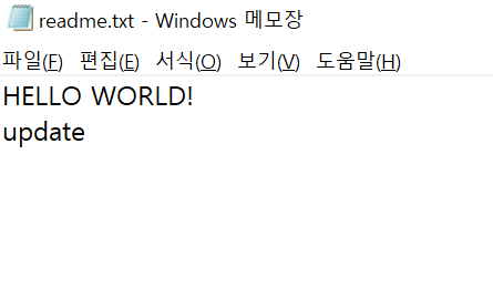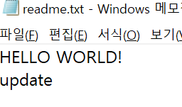 위와 같은 메시지가 출력되며, 최초의 commit이 완성되었습니다. 축하합니다! 자, 이제 지체하지 말고 다음으로 넘어가겠습니다. 이번에는 이 상태에서 아까 만들어놓은 readme.txt 파일을 수정해 보겠습니다. 간단하게 "update"라는 텍스트를 한 줄 추가해 보겠습니다.