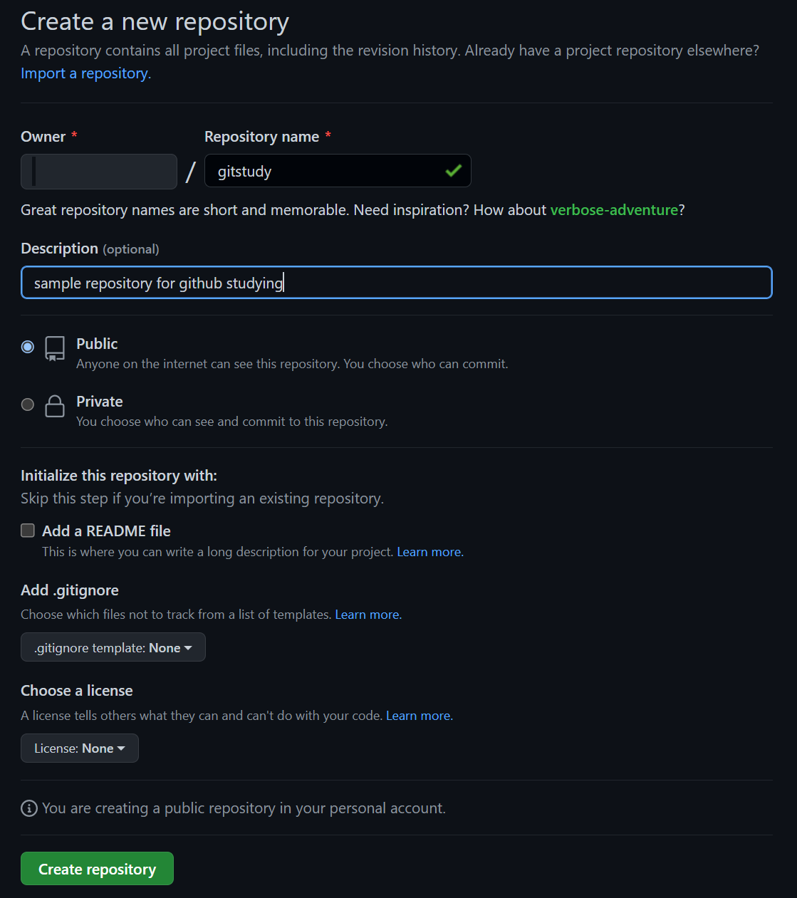 우선 github.com으로 이동해, 본인의 계정으로 로그인하여 우측 상단의 메뉴를 통해 [New Repository]를 실행해 새로운 원격저장소를 생성해 봅시다.