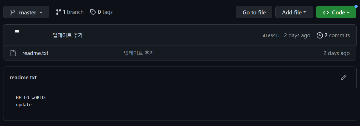 위와 같이 완료 메시지를 확인할 수 있습니다. 이제 브라우저를 통해 github의 repository로 돌아가 보겠습니다. 그럼 다음과 같이, 우리가 앞서 작업한 readme.txt 파일과 커밋 내용이 등록된 것을 확인할 수 있습니다.