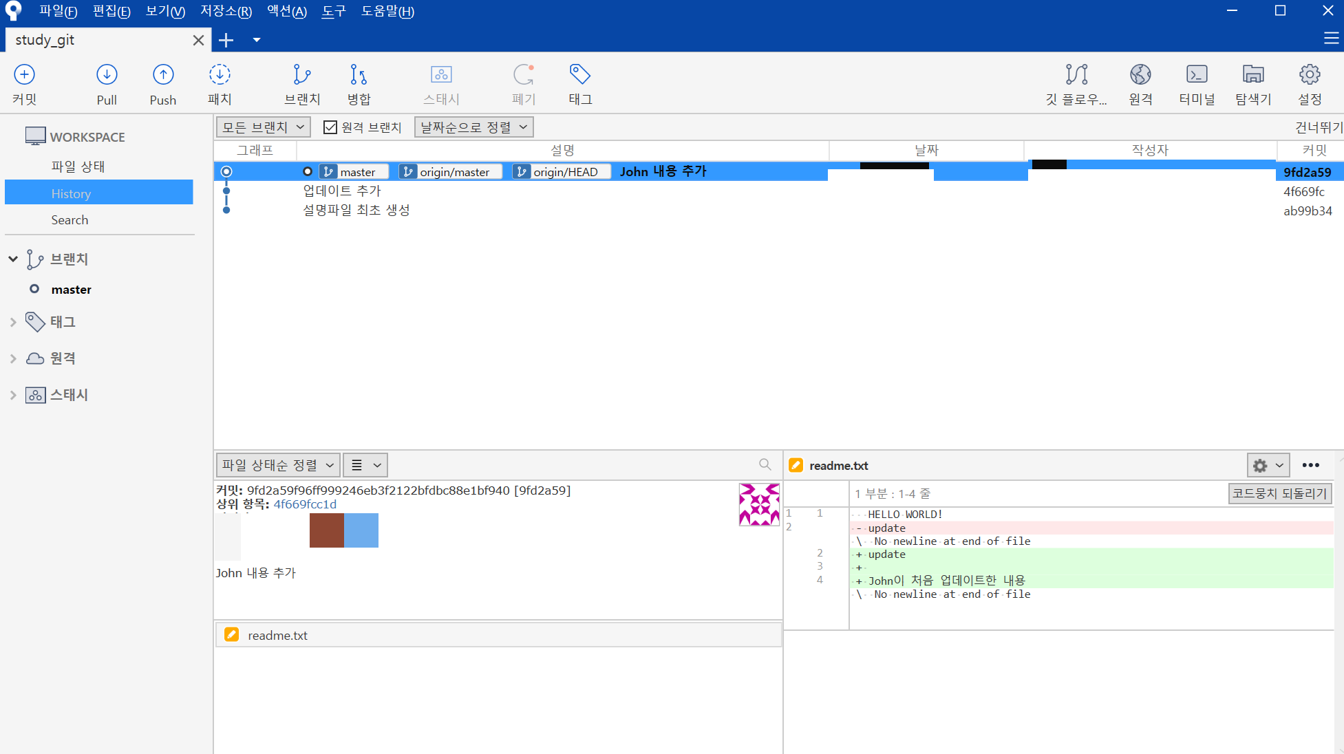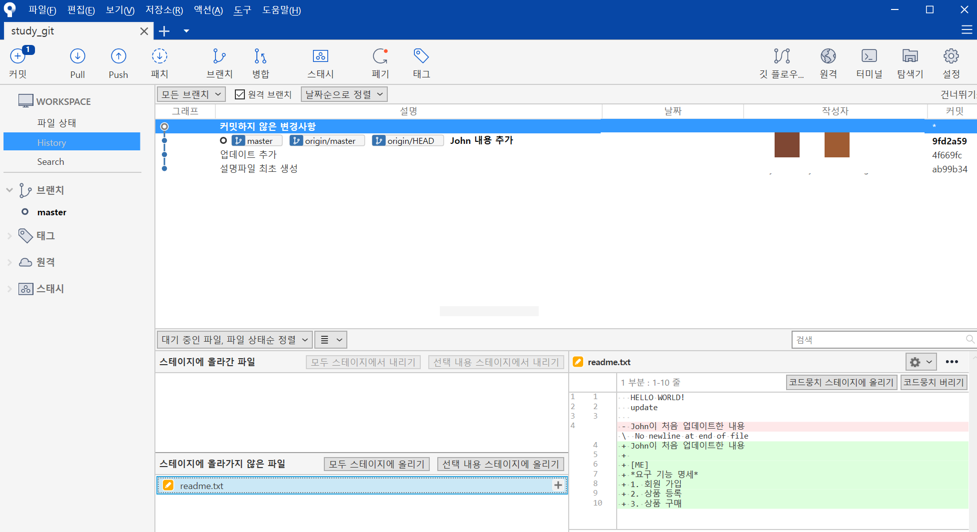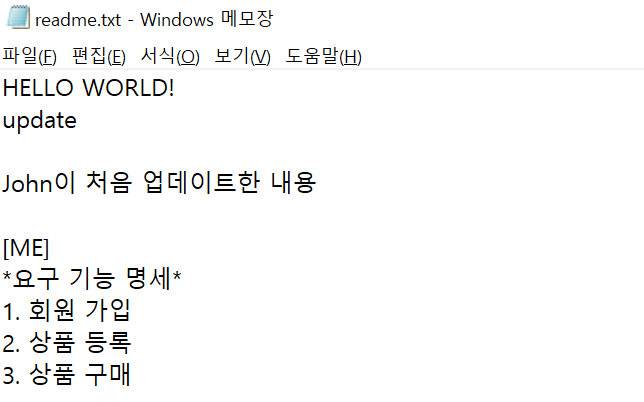 이제, 우리가 CLI에서 $git 명령어를 통해 실습했던 파일 내용 변경 커밋을 소스트리에서 실행해 보도록 하겠습니다. 일단, (John이 아닌) 본인이 파일의 내용을 변경했다고 가정해 보겠습니다. [study_git] 폴더에서 readme.txt 파일에 다음과 같이 내용을 추가하였습니다.