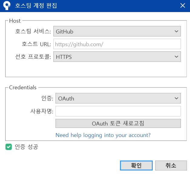 우선 소스트리 실행 후, 호스팅 계정과 관련한 설정을 다음과 같이 진행합니다. 우리는 github를 사용하니, 호스팅 서비스에서 github를 선택하고 아래 스크린숏처럼 설정을 진행한 다음 OAuth 토큰 새로고침까지 진행한 다음 [확인]을 클릭합니다.