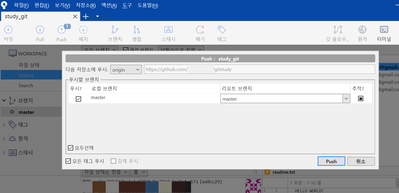 상단 탭의 Push에 [1]이란 숫자가 있습니다. 이는, 로컬 저장소에서는 커밋이 생성되었지만 아직 repository에 반영되지 않은 커밋이 1개가 존재한다는 뜻입니다. 이제 [Push] 버튼을 누르면 완료됩니다. 이 과정은 CLI에서 다음 명령어와 같은 동작을 의미하게 됩니다.