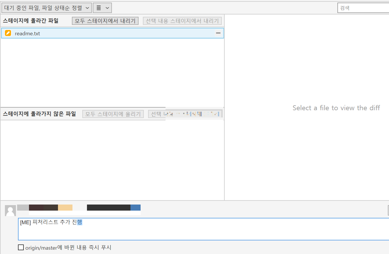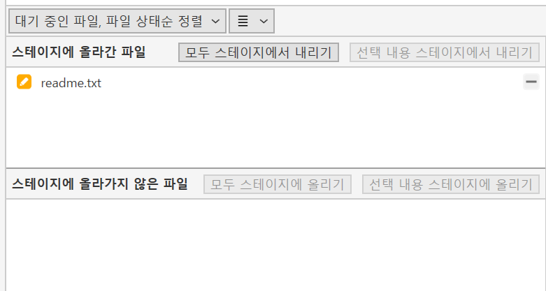 변동이 생겨서 커밋을 만들 파일을 add 명령어로 지정하였습니다. 이 과정을 소스트리에서는 [스테이지에 파일을 올리는] 작업으로 처리하게 됩니다. 로컬 저장소에 변경이 생긴 파일들을 자동으로 감지해 보여주고, 이 중 커밋을 원하는 파일을 선택해 [스테이지]에 올리게 되는 것이죠. 하단의 '스테이지에 올라가지 않은 파일' 영역에서 [+] 버튼을 통해 readme.txt 파일을 올렸습니다.