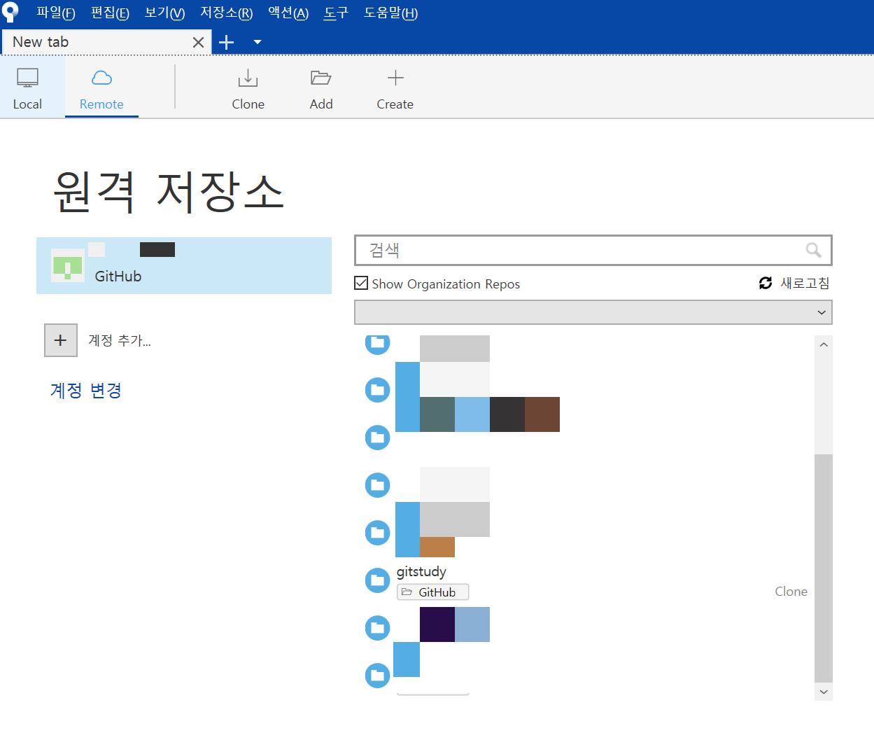 이제 설정을 완료한 다음, Remote 탭에서 계정 연동이 완료되면('새로고침' 클릭) 다음과 같이 본인의 github 계정에 생성되어 있는 repository가 출력됩니다.