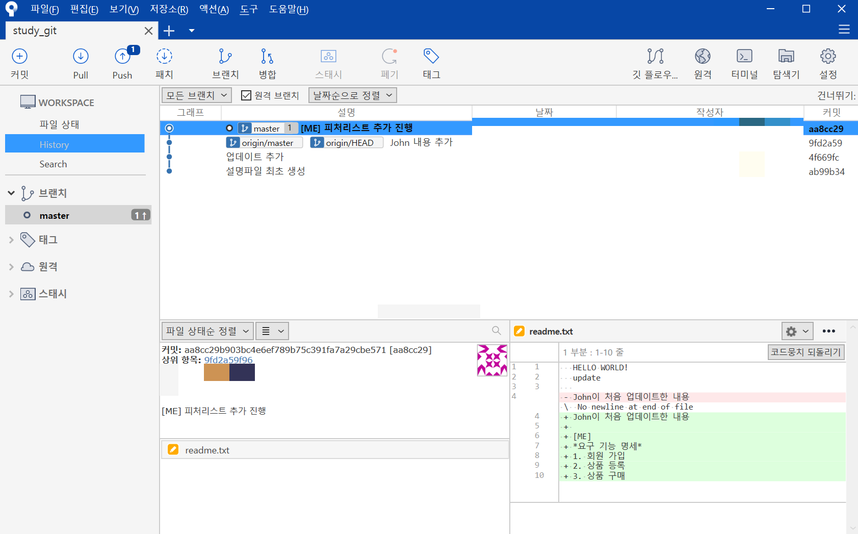 그럼 위의 이미지를 볼까요? [origin/master] 태그는 "John 내용 추가"에 위치하고 있고, [master] 태그는 "[ME]피처 리스트 추가" 영역에 있습니다. 우리가 로컬 저장소(PC)에서 작업해 커밋을 만들었지만 아직 github 원격 저장소 repository에는 등록하지 않은 상태입니다. 우리는 곧 push 명령을 통해, github repository에도 이 내용을 반영할 예정입니다.