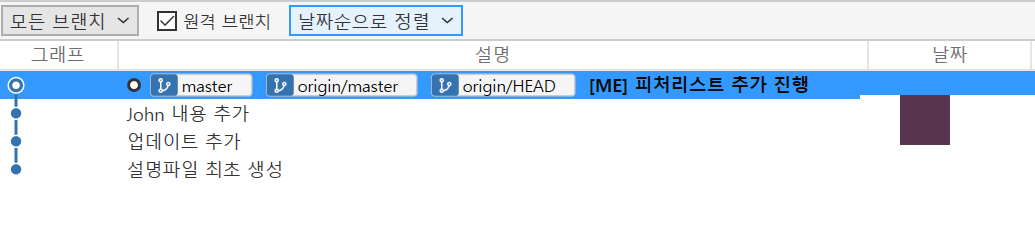 이 작업이 완료되고 소스트리 상태를 다시 보겠습니다. 가장 최신의 "[ME] 피처리스트 추가 진행" 커밋에 [master]와 [origin/master] 태그가 모두 붙어있습니다. 로컬 저장소의 커밋이 repository에도 정상적으로 반영되었다는 의미가 됩니다.