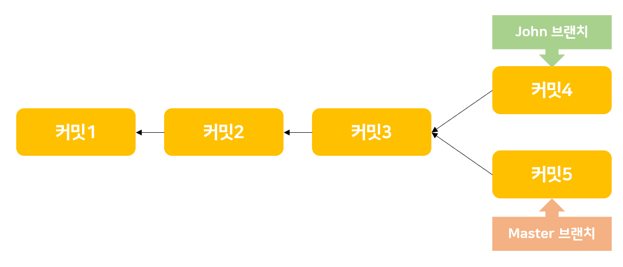 위에서 우리는 [커밋3]부터 작업을 동시에 한다고 가정했습니다. 그래서 ME의 브랜치와 John의 브랜치는 모두 커밋3을 가리키고(pointing) 있게 되죠. 이렇게 줄기(브랜치)를 master 한 개가 아닌 두 개의 줄기로 나누어 작업하게 되면, 커밋3를 기준으로(바라보고) 작업을 하더라도 병렬로 진행할 수 있게 됩니다.