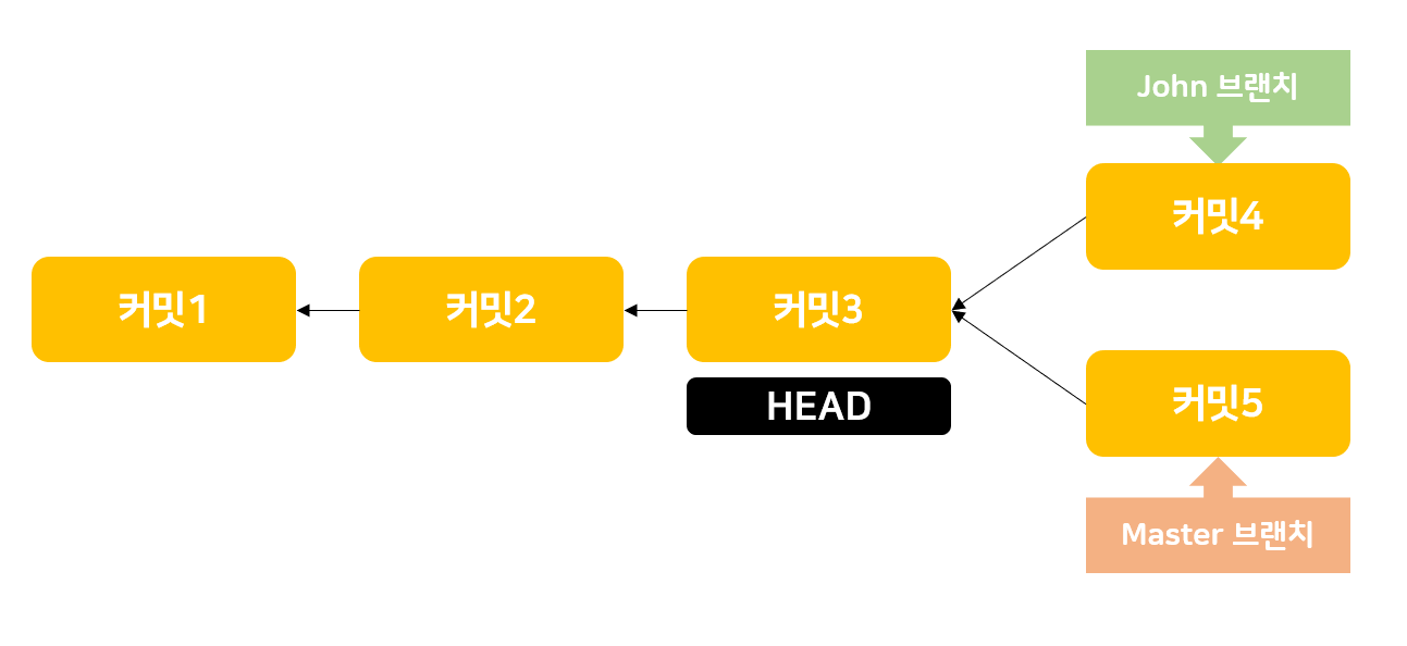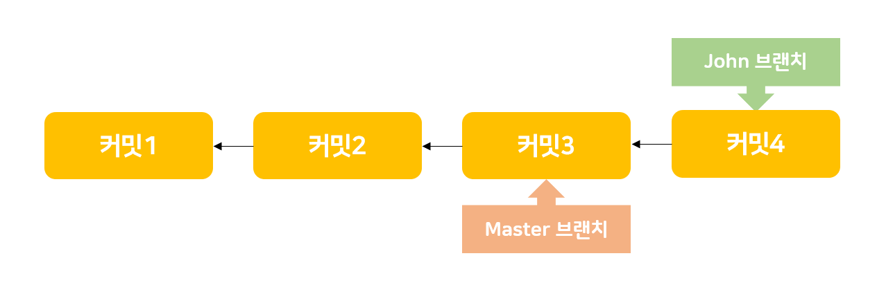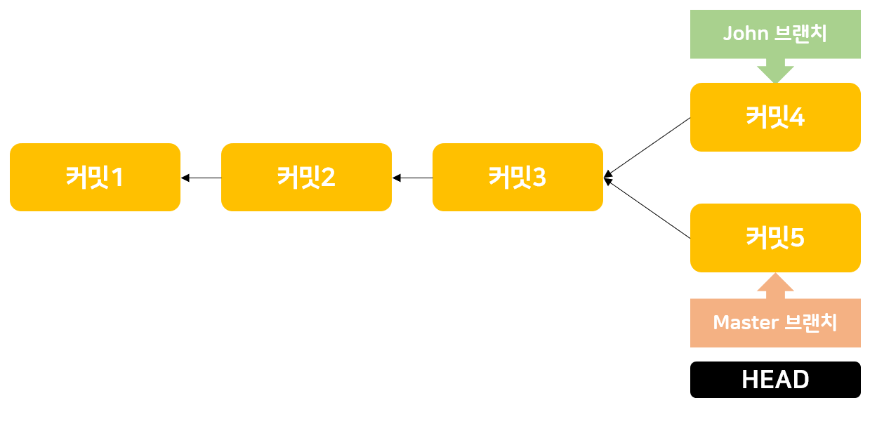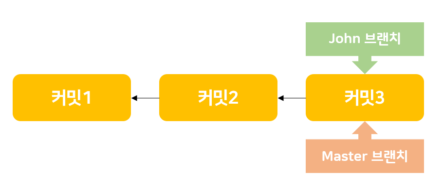 2. 이제 이 상태에서, 예를 들어 [John]이라는 브랜치가 생성되었다고 봅시다. 이 상태에서 브랜치가 생성되면, 기준점은 "커밋3"가 됩니다. 그럼 새로 생성된 [John] 브랜치도 "커밋3"를 가리키게 됩니다.