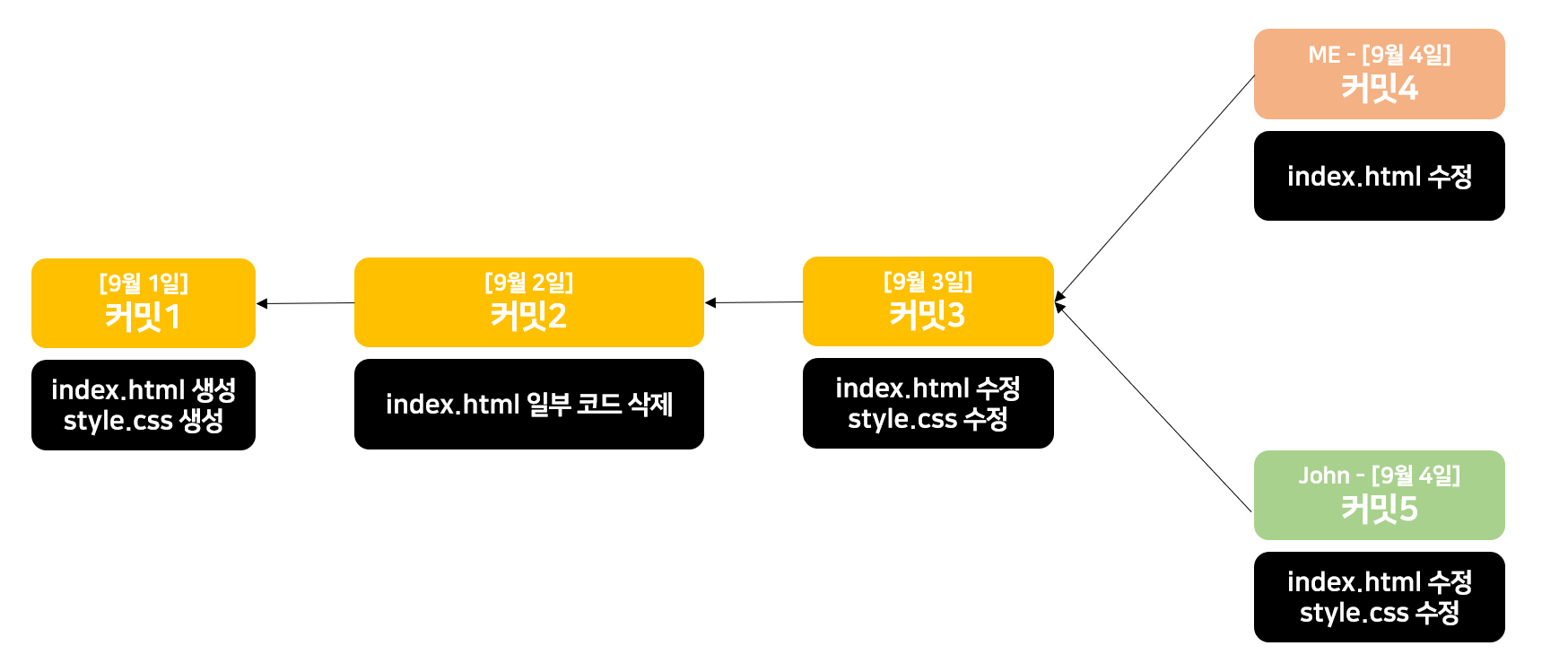 그리고 9월 4일이 되었습니다. 9월 4일 오전에 ME는 평소처럼 index.html에 수정사항이 생겨서 커밋을 진행하고 push를 했습니다. 커밋 4가 생성되었겠죠? 그런데 9월 4일 오후에 특별한 조작 없이 John 역시 index.html에 수정사항이 생겨서 코드를 수정하고 커밋을 만들었습니다. 그리고 push를 하려고 하는데 에러가 발생했습니다. 왜일까요?