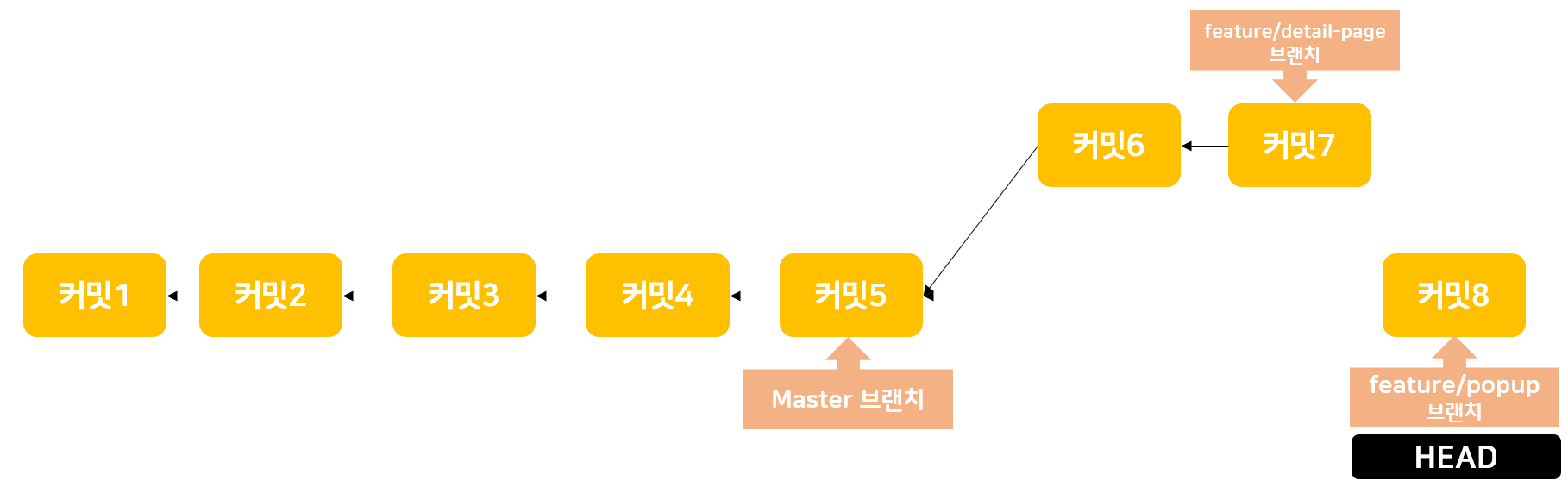 이전 아티클까지 우리는 [master] 브랜치에서 파일 작업을 하다가, [master] 브랜치의 특정 시점을 기점으로 [feature/detail-page] 라는 새로운 브랜치를 생성했고 이 새로운 브랜치에서 두 번의 커밋을 진행했습니다.