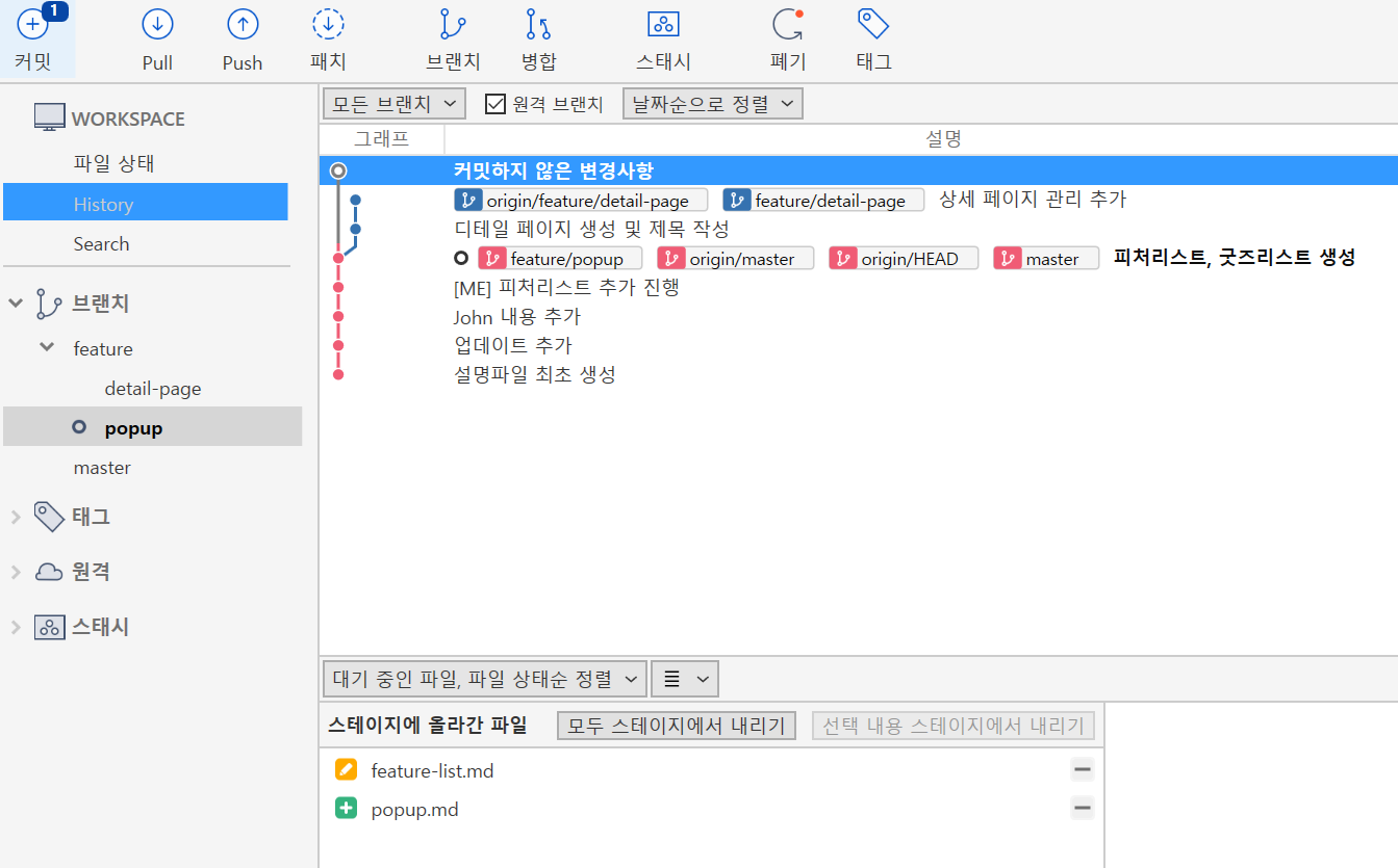 5. 자, 이 상태에서 파일을 하나 더 추가하겠습니다. "popup.md"를 생성하고, 팝업 기능 이라는 텍스트를 한 줄 입력했습니다. 이제 "feature-list.md"와 "popup.md"를 '팝업 기능 추가'라는 커밋으로 진행합니다.