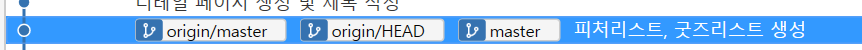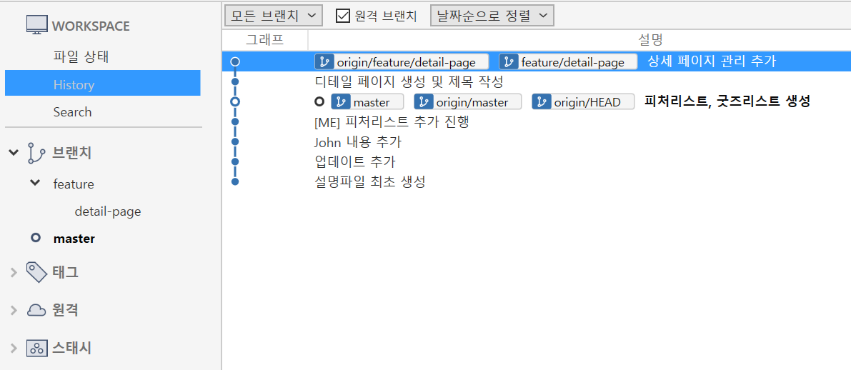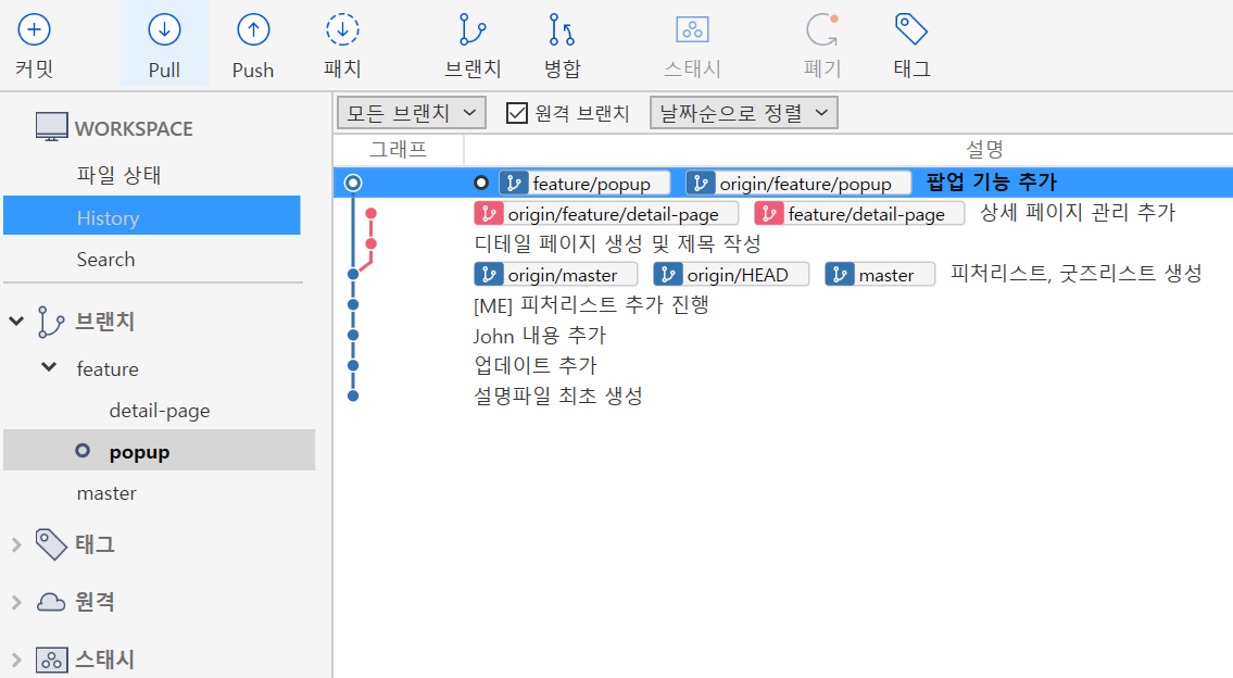6. 이제 push까지 진행되었다면, 아래와 같은 브랜치 히스토리를 확인할 수 있습니다. [master] 브랜치의 '피처리스트, 굿즈리스트 생성' 커밋을 기점으로 [feature/detail-page] 브랜치와 [feature/popup] 브랜치가 뻗어져 나온 상태가 되었습니다.