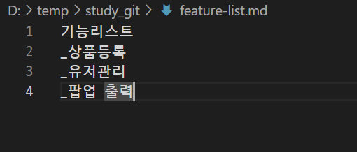 4. 자, ME의 로컬 저장소에 있는 "feature-list.md"에는 [feature/detail-page] 브랜치에서 작업한 내용이 반영되어 있지 않습니다. 그래서 넷째 줄에 _상세 페이지 관리 라는 텍스트가 없어졌습니다. 일단 우리는 향후의 충돌 실습을 위해 이 넷째 줄에 _팝업 출력 이라는 텍스트를 삽입하겠습니다.