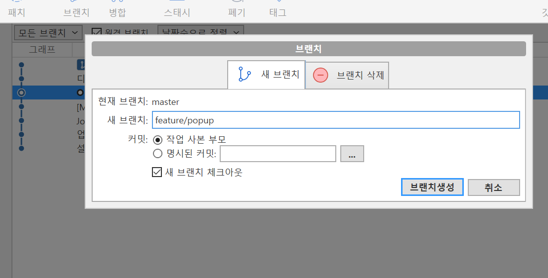 2. 이번에도 메뉴 상단의 '브랜치' 메뉴를 클릭해 새로운 [feature/popup] 브랜치를 생성해 줍니다.