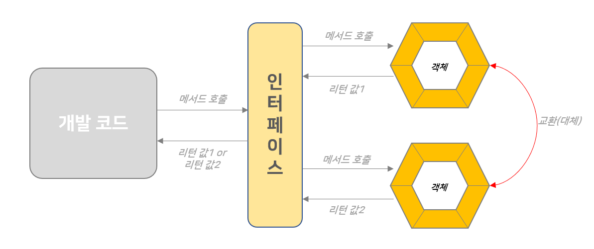 만일 개발 코드에서 인터페이스의 메서드를 호출하게 되면, 그 인터페이스는 대상이 되는 객체의 메서드를 호출하게 됩니다. 그러면 객체는 그 리턴 값을 인터페이스에 전달하고, 리턴 값은 인터페이스를 통해 다시 개발코드에 전달하게 됩니다. 마치 중개사 같죠? 그래서 굳이 비유하자면, 개발 코드 레벨에서는 굳이 그 객체의 구조를 알아볼 필요 없이 인터페이스의 메서드만 알고 있으면 메서드를 정상적으로 사용할 수 있게 됩니다.