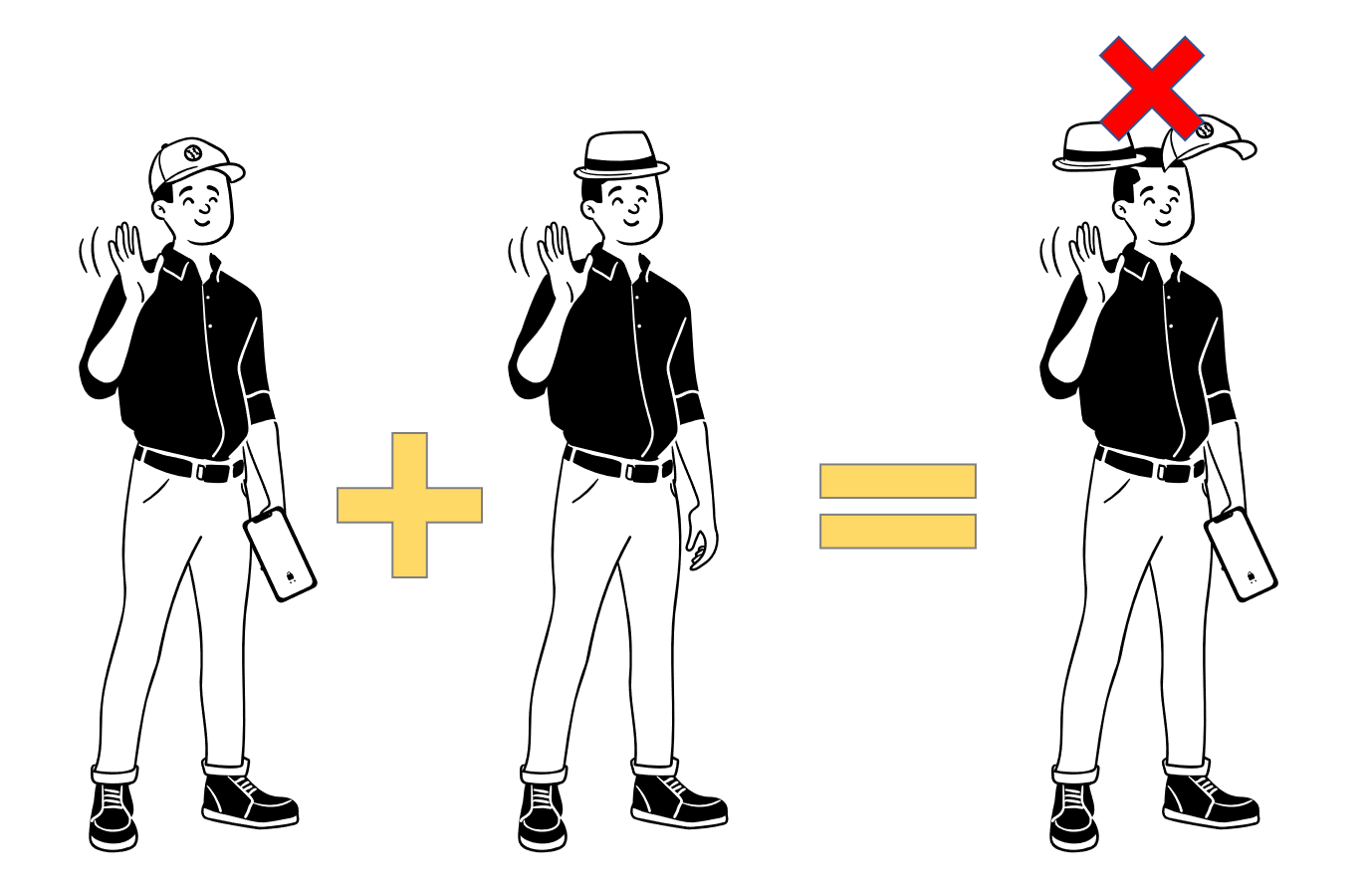 위의 경우에는 첫 번째 그림에서 들고 있는 스마트폰을 합쳐주게 됩니다. 그런데, 모자에서 문제가 생깁니다. 두 그림 모두 모자를 쓰고 있기 때문에 모자 영역에서 충돌이 발생하는 것이죠. 이 경우에 git에서는 '어떤 모자를 골라야할지'를 선택할 수 없습니다. 그래서 '충돌'이 발생하게 되고, 이를 수동으로 선택해줘야 합니다. 이 충돌 관리는 추후 다시 살펴보겠습니다.