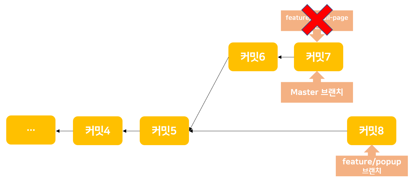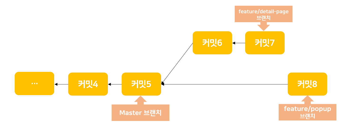 위의 그림이 현재까지의 진행 상태입니다. [master] 브랜치는 '커밋5'를 가리키고 있는 상태이고, [feature/detail-page] 브랜치는 '커밋5'를 기준으로 작업을 별도로 진행해 '커밋7'까지 작업했습니다. 한편 [feature/popup] 브랜치는 역시 '커밋5'를 기준으로 수정 작업을 진행해 '커밋8'을 생성해 둔 상태입니다.