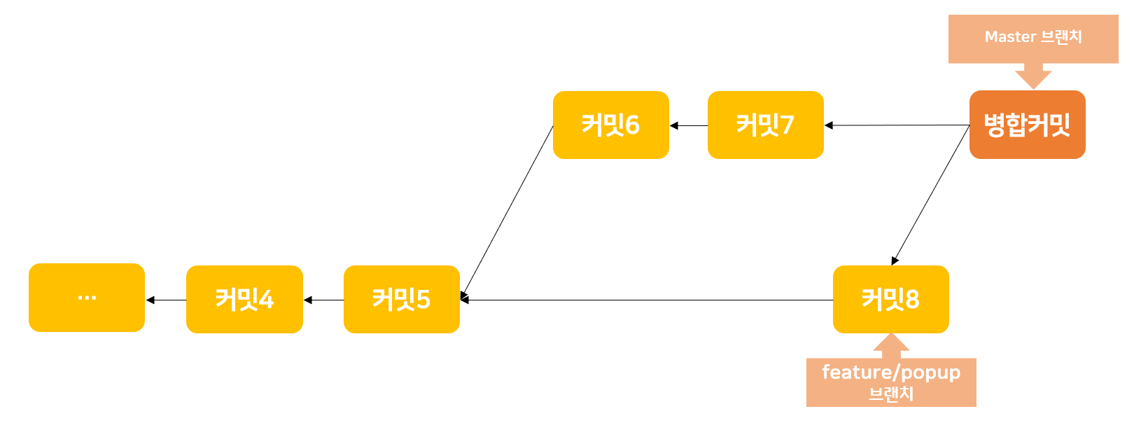 중요한 것은, '어느 브랜치에 합칠 것인가?' 입니다. 우리는 앞서 전제조건으로 피처 브랜치에서 작업된 것을 [master] 브랜치에 병합한다고 정했습니다. 그럼 이 "새로운 병합 커밋"은 [master] 브랜치에 생겨나게 됩니다. 그럼 [feature/popup] 브랜치에서는 어떤일이 벌어지나요? 아무일도 일어나지 않습니다. 위 그림 기준으로 '커밋8'을 가리키는 상태가 그대로 유지되고, [master] 브랜치에만 병합된 결과물 커밋이 하나 생기게 됩니다. (만일 반대로 병합하면 [master] 브랜치는 그대로 유지되고, 피처 브랜치에 새로운 커밋 결과물이 생겨나게 되겠죠)