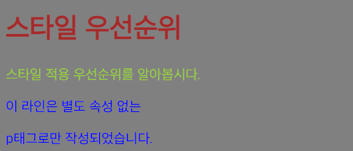 <p style="color: yellowgreen;">스타일 적용 우선순위를 알아봅시다.</p>