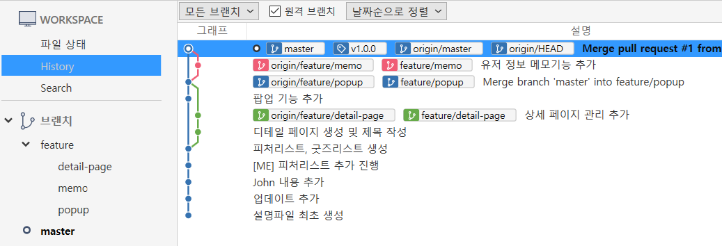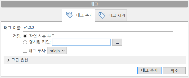 이제 우리가 실습한 브랜치 작업에서 버전을 명기하고 릴리즈를 진행해 보겠습니다. [master] 브랜치 상태에서 [태그] 버튼을 클릭하여 v1.0.0으로 태그 이름을 지정하고 태그 추가를 진행해 보겠습니다.