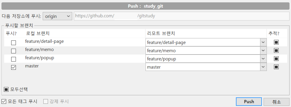 자, 이제 이 태그 작업을 github 원격 저장소에서도 확인할 수 있어야겠죠? 현재 상태에서는 소스트리에서만 적용된 태그이므로 별도 push 작업을 진행해줘야 합니다. 현재 상태에서 Push를 클릭해 [master] 브랜치 원격 저장소에도 반영되도록 해보겠습니다. 이때, '모든 태그 푸시'를 꼭 체크해 주세요.