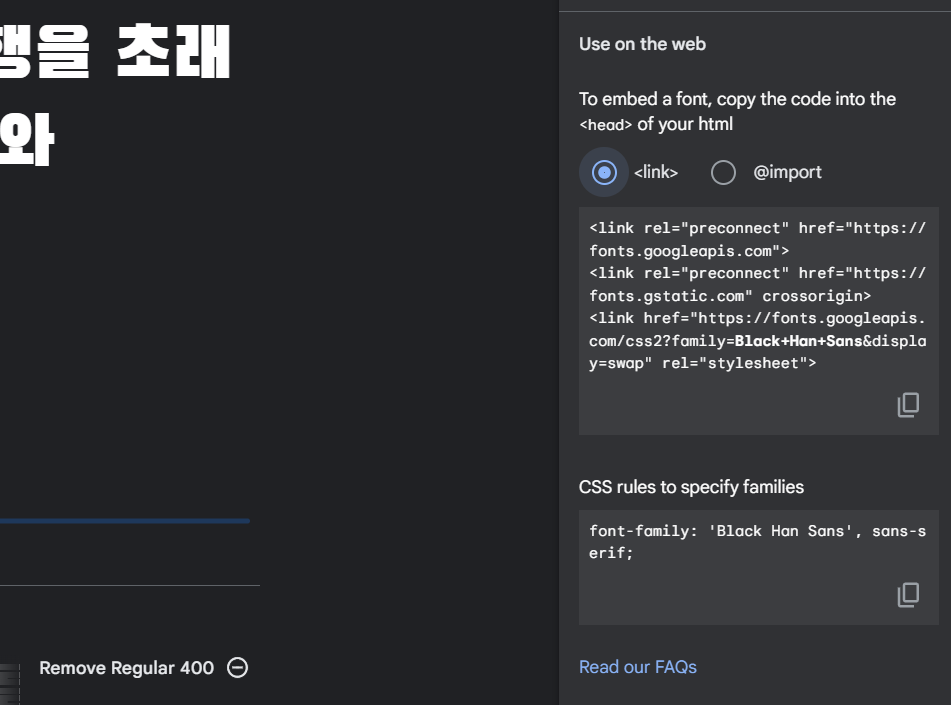 일단 google fonts 페이지로 들어가, Language를 한글로 바꾸고 적당한 폰트를 선택합니다. 저는 Black Han Sans를 골랐습니다.