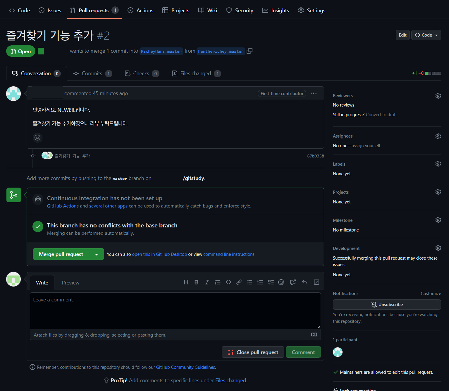 이제 우리가 봤던 pull request 화면이 출력됩니다. 여기서 변한 것은, 원격 저장소의 브랜치에서 원본 저장소의 브랜치로 변경되는 것이기 때문에 base와 compare 정보에 추가로 repository에 대한 내용이 출력된다는 점입니다.