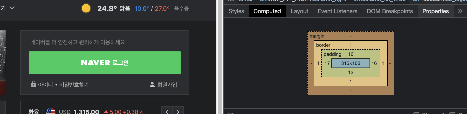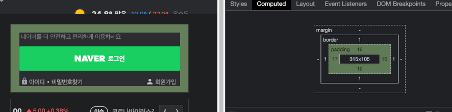 위와 같이 구성됩니다. 이를 크롬에서 어떤 식으로 적용되는지 확인할 수 있습니다. 예를 들어, 네이버 메인 페이지의 계정 영역을 살펴보겠습니다.
