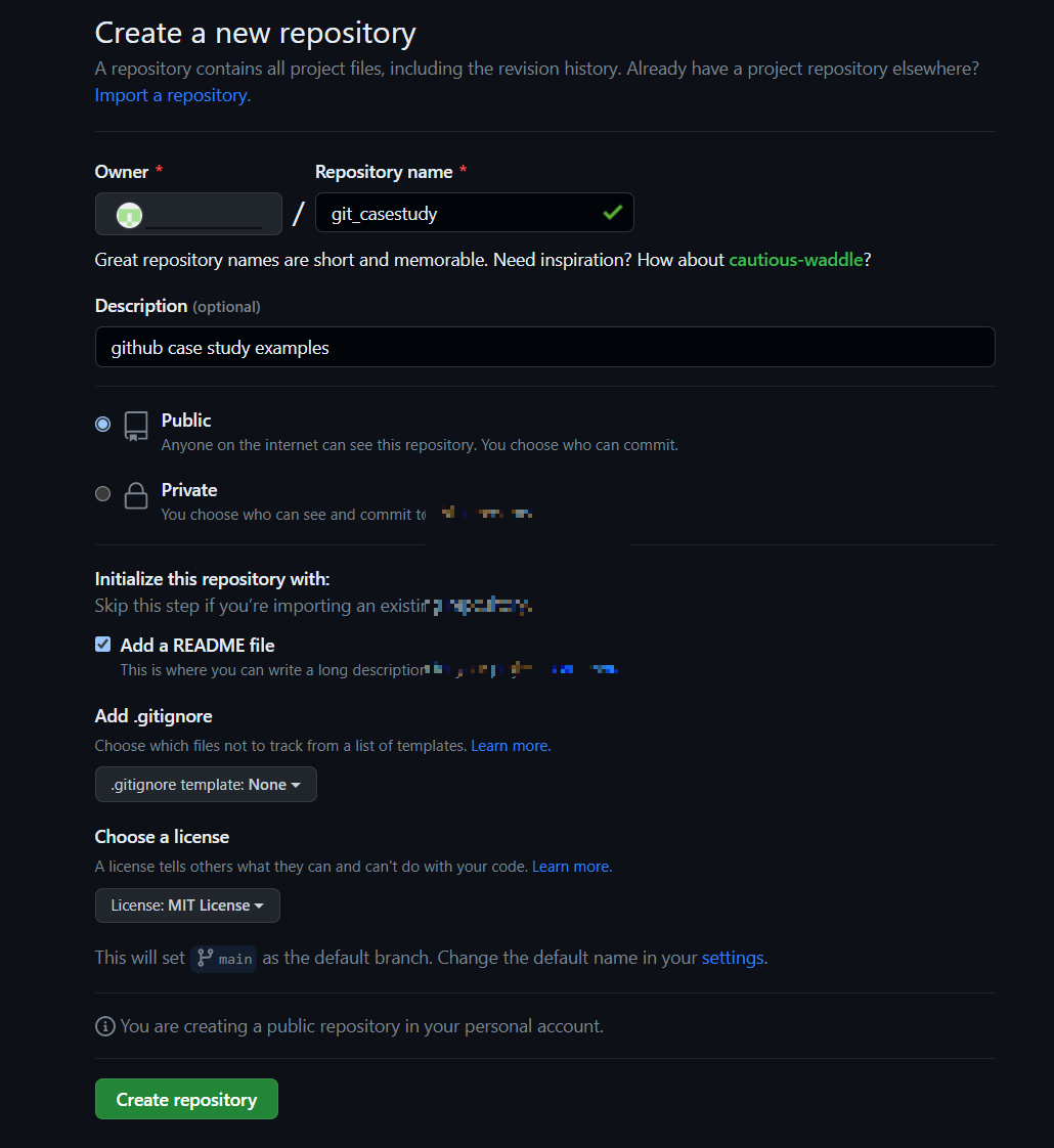 우선 우리가 지금까지 실습해 온 계정을 기준으로 했을 때, "ME"의 계정으로 github 페이지에 로그인 한 다음, [New repository]를 실행해 줍니다. 이 원격 저장소의 이름은 [git_casestudy]로 정해보았습니다. 옵션도 체크해 주겠습니다. Readme.md 파일도 기본으로 생성하도록 하고, 라이선스 역시 지정해 보겠습니다. MIT Lcense를 통해 수정 후 재배포가 가능하도록 설정했습니다(연습이니 큰 의미는 없습니다).