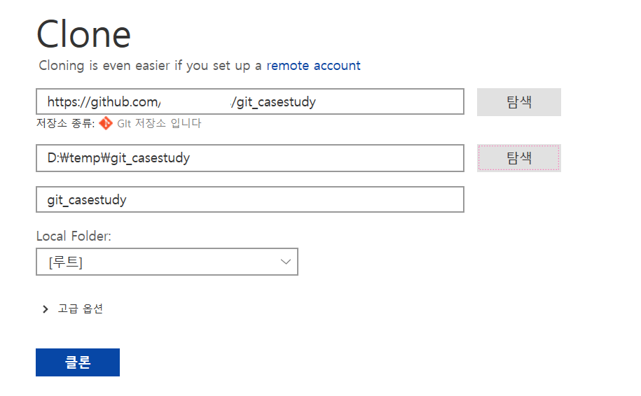 클론 화면에서 저장소의 주소, 로컬 저장소로 사용할 폴더 위치, 저장소 이름까지 모두 세팅했다면 [클론]을 클릭해 보겠습니다.