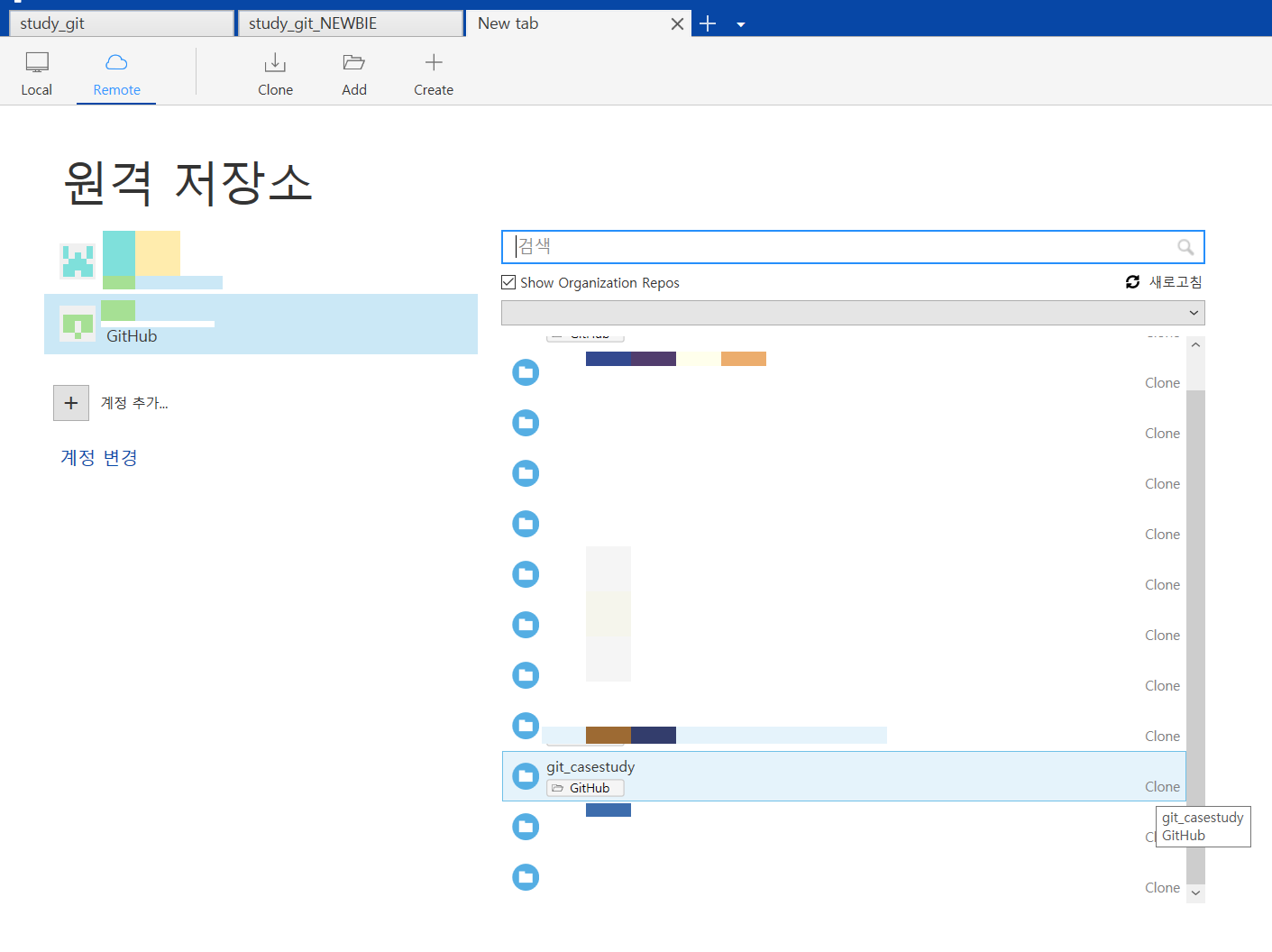 우선 탭에서 [+] 버튼을 통해 새로운 저장소 탭을 생성하고, 여기서 ME의 계정을 클릭해 우리가 만든 [git_casestudy] 계정을 찾은 다음 [Clone]을 클릭합니다.