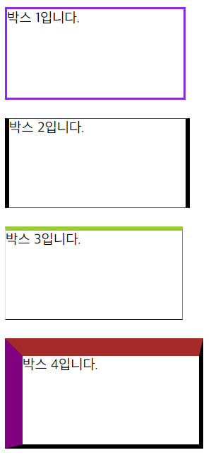 · 박스 3의 경우 think / thin / thin 세 개의 값이 입력되었습니다. 우선 순서대로 top, right, bottom에 적용됩니다. 그런데 left에 대한 값이 빠져있습니다. 이 경우, left는 마주 보고 있는 right의 속성을 그대로 사용하게 됩니다.