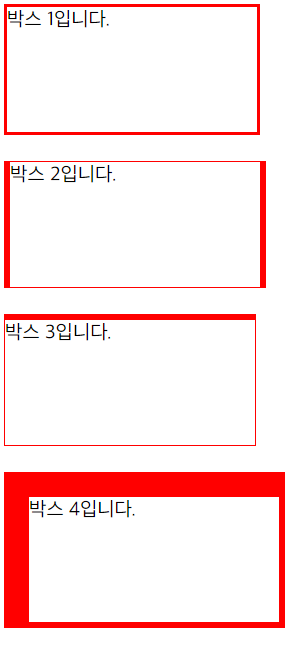 · 박스 2의 경우에는 thin, thick 두 개의 값이 작성되었습니다. 이럴 경우에는 처음의 thin은 top+bottom에 적용되고 두 번째 thick은 left+right에 동시 적용됩니다.