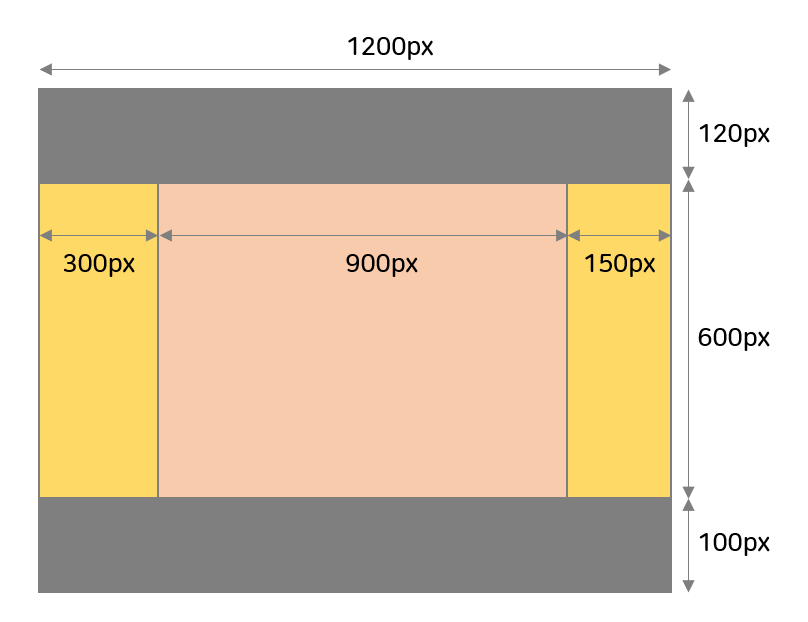 이번에는 해당 방식을 응용하여 3단(칼럼) 레이아웃을 만들어 보도록 하겠습니다. 만들고자 하는 레이아웃의 사이즈는 아래 그림과 같습니다.