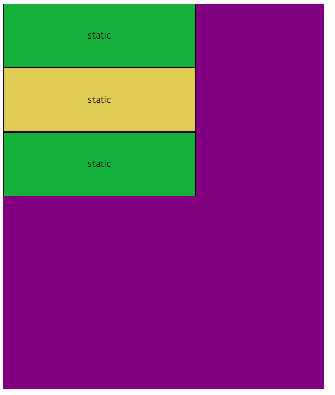 그럼 position 속성에서의 기본 값은 무엇을 의미할까요? 다름 아닌 요소들이 그냥 순서대로, 딱 붙어서 순서대로 HTML의 흐름에 맞춰서 배치되는 것을 의미합니다. 해당 요소에 대해서 어떤 위치 값을 임의로 바꾸는 것도 해당되지 않습니다. 위에서 설명한 left, right, top, bottom이 먹히지 않죠. 단순하게 <div> 태그 세 개를 가지고 배치해두면 그냥 순서대로 블럭 라인 요소 속성을 기반으로 하나씩 배치됩니다. 다음 예제를 보겠습니다.
