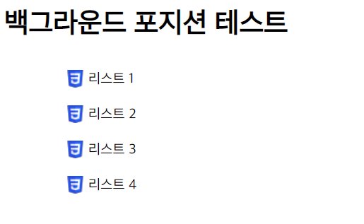아래와 같은 예시에서 background-position을 좀 더 디테일하게 사용해 보겠습니다. 일단 <ul> 태그로 불릿이 있는 리스트를 만들어 보겠습니다. 그리고 임의의 아이콘 이미지를 <li> 태그에 적용해 기존의 불릿을 제거하고 해당 아이콘 이미지를 불릿으로 써먹어 보겠습니다.