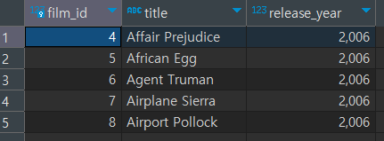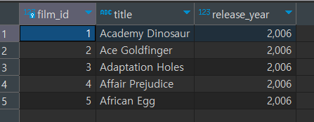 FILM테이블에서 FILM_ID, TITLE, RELEASE_YEAR를 출력하는데 5개만 출력해 보도록 하겠습니다. 단! 여기서 아무거나 5개를 출력하는 게 아니라 FILM_ID 순서를 기준으로 1~5번만 출력해야 합니다. 한번 쿼리를 작성해 보겠습니다.