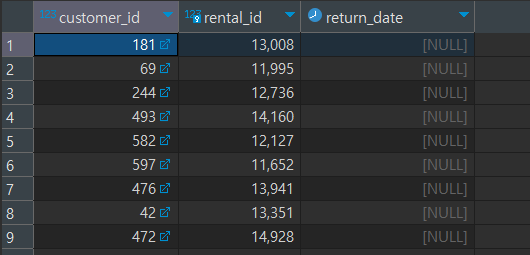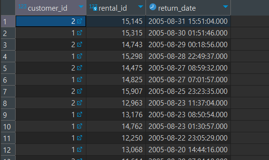 Q. RENTAL 테이블에서 CUSTOMER_ID가 1번 또는 2번인 고객의 CUSTOMER_ID와 RENTAL_ID, RETURN_DATE를 출력하세요. 단, 정렬은 회수 일자를 기준으로 내림차순으로 해주세요.