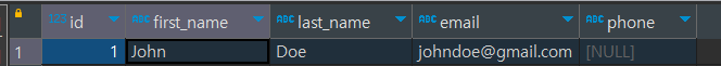 values ('John', 'Doe', 'johndoe@gmail.com', null),