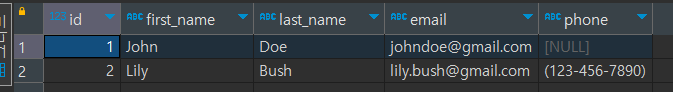 위의 명령어를 통해 칼럼 ID / FIRST_NAME / LAST_NAME / EMAIL / PHONE을 가진 테이블 CONTACTS를 생성했습니다. 이제 여기에 두 명의 데이터를 삽입하도록 하겠습니다.