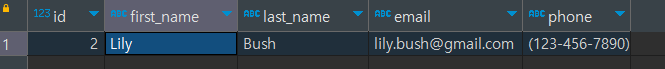 ('Lily', 'Bush', 'lily.bush@gmail.com', '(123-456-7890)');