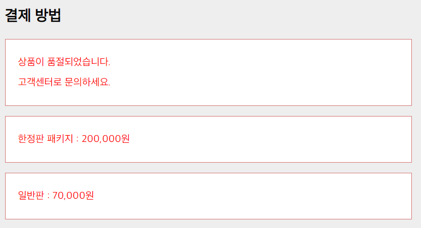 <p>상품이 품절되었습니다. <br>고객센터로 문의하세요.</p>