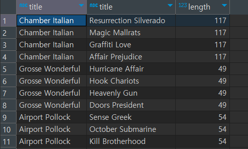 일단 가볍게 전제조건을 생각해 보면, 출력해야 하는 칼럼은 TITLE / TITLE / LENGTH가 될 것입니다. 그리고 FILM이라는 테이블에 해당 내용들은 모두 들어가 있으므로, SELF JOIN을 통해 FILM 테이블을 매칭해야 할 것 같습니다.