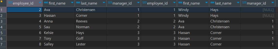 위에서 말했듯이 이번에는 직속 상사가 NULL인 Windy Hays까지 포함해서 모든 데이터가 리스트로 출력되었습니다. INNER JOIN과 OUTER JOIN의 특성은 그대로 활용하되, 테이블 1개를 중복해서 비교하는 과정입니다.