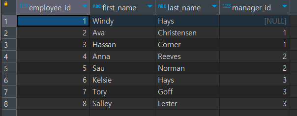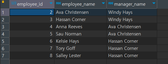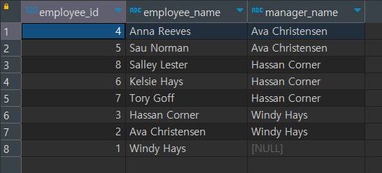 우선 위의 테이블에 대해서 간단하게 개념을 정의하고 넘어가 보겠습니다. 일단, EMPLOYEE_ID는 우리가 흔히 얘기하는 '사번'을 뜻한다고 생각합시다. 더불어 MANAGER_ID는 '직속 상사의 사번'이라고 정의합니다. MANAGER_ID라는 칼럼이 별도로 있지만, 기본적으로는 EMPLOYEE_ID 즉 사번을 그대로 사용합니다. 예를 들어서 Ava Christensen과 Hassan Corner 두 사람은 모두 사번 1번인 Windy Hays가 직속 상사(팀장)입니다. 참고로 Windy Hays는 상사가 NULL입니다. 이는 곧 Windy Hays가 회사의 대표이사라 정도의 위치를 차지한다는 의미가 되겠죠. 4~8번까지의 직원들은 각자 상사가 존재하는데, 자연스럽게 조직도 형태가 그려지게 됩니다.