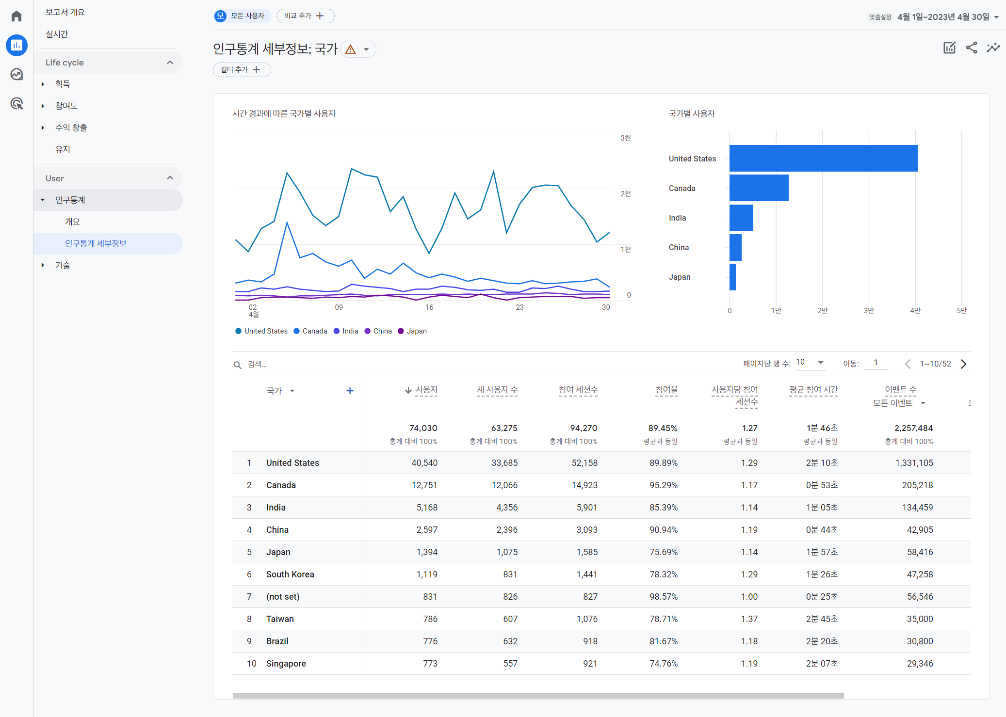 위의 측정 항목에서 이벤트와 전환을 모두 "purchase"로 선택했더니, 같은 수치가 나오는 것을 확인할 수 있습니다. 여기서 미국의 전환률을 계산해 본다면, 전환수 1,079 / 사용자 수 40,540 가 됩니다. 약 2.7%가 되네요. 캐나다는 0.25% 정도입니다. 이제 이러한 데이터를 기반으로 '미국에서 광고를 집중하자' 혹은 '미국은 마케팅이 없어도 되겠다'는 등의 의사결정을 하게 됩니다.