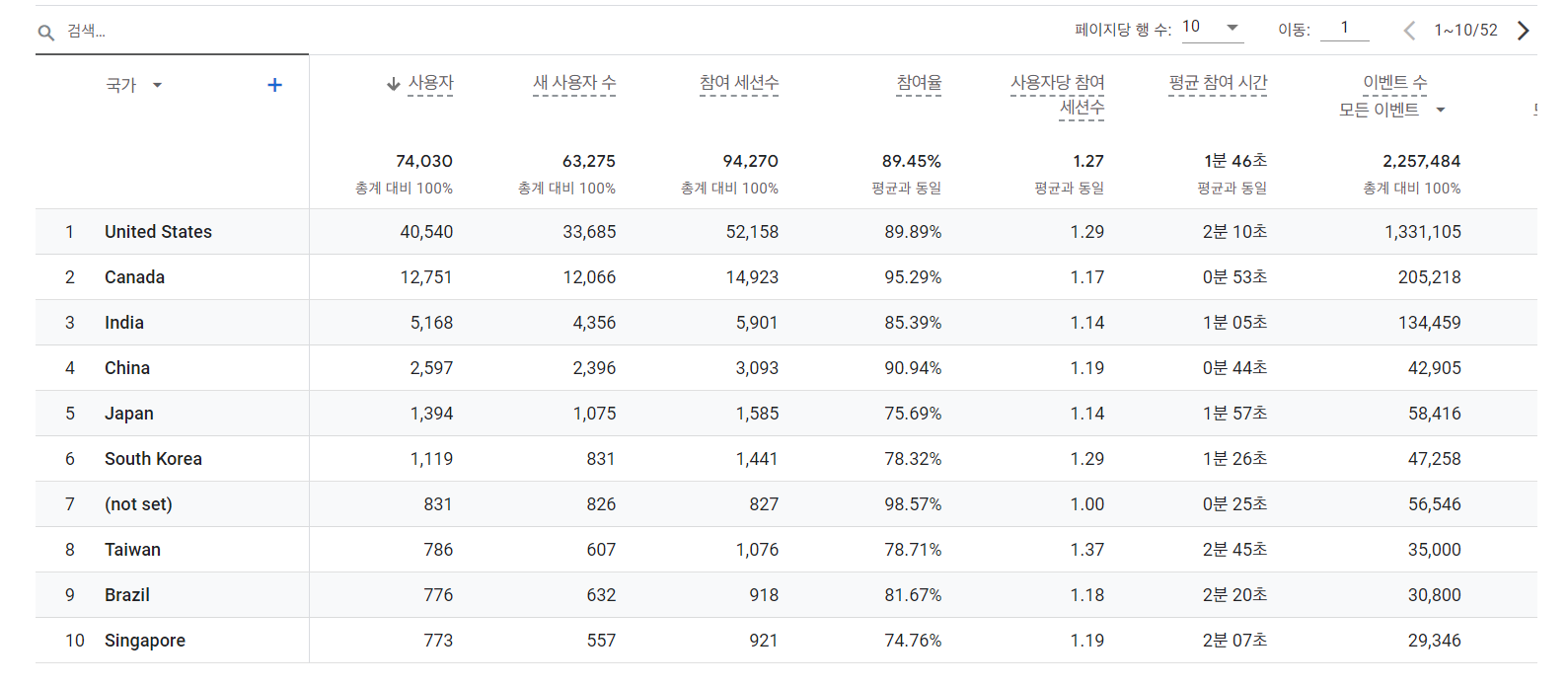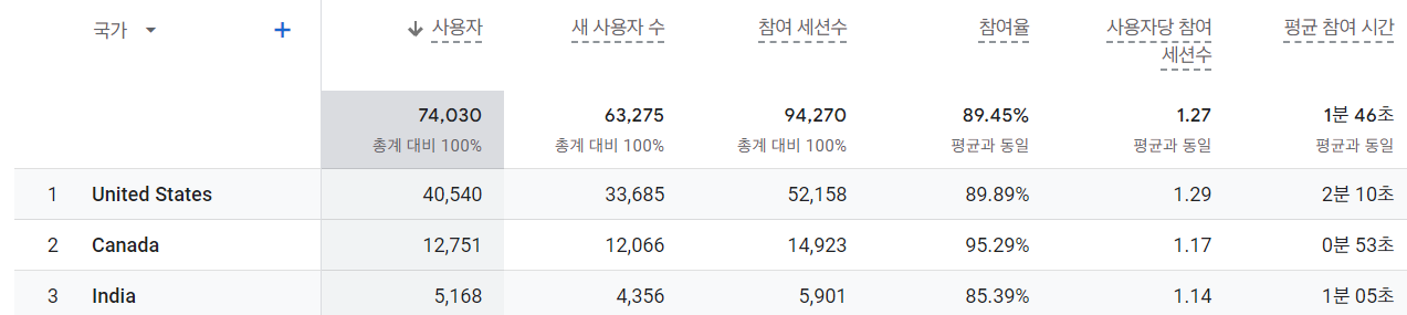 (2) 그럼 바로 옆의 측정 항목인 [참여율]은 무엇을 의미할까요? 바로 참여 세션수 / 전체 세션수를 계산한 비율입니다. 위의 표 예시에서 United States의 참여율은 89.89%입니다.