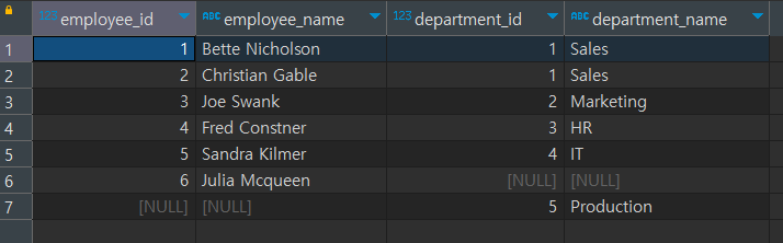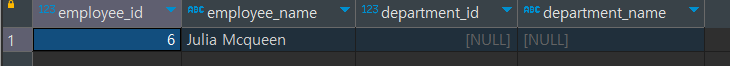 우선 1행부터 5행까지는 우리가 익히 알고 있는 방식으로 매칭된 행이 출력되었습니다. 그럼 6행은 어떨까요? Julia Mcqueen은 소속 부서가 없어서 DEPARTMENT_ID가 NULL이었습니다. 그 값이 그대로 출력되었고, 반대로 7행에서는 Production 부서에 소속된 임직원이 아예 없어 NULL 인 상태가 그대로 표시되었습니다.